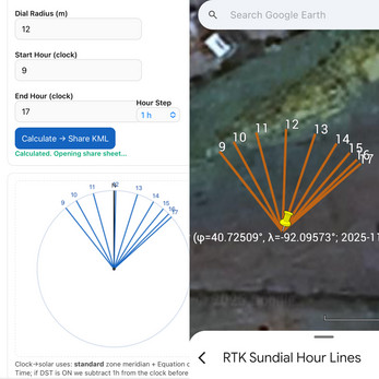 - The KML export lets you visualize or survey your sundial using RTK GPS, drones, or mapping apps like SW Maps and Google Earth.