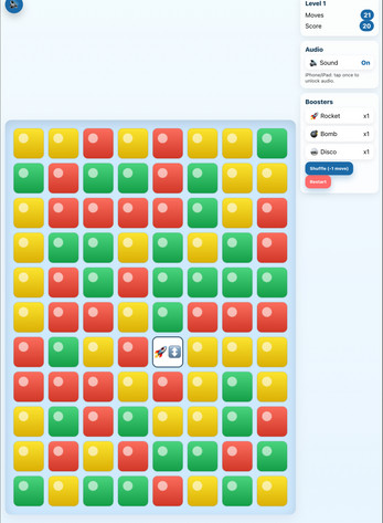 Your moves counter starts at the levelβs move budget (Level 1 = 22) and is reduced by specific actions. When it hits 0 — or when the board has no playable matches/powers — the game ends.